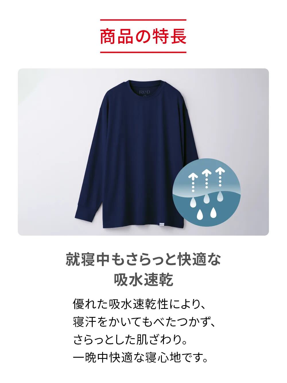 ゆったりとしたシルエットで寝返りがしやすく、ストレスフリーな着心地です。 吸水速乾性に優れているから、寝汗をかいてもさらっとした肌触り。