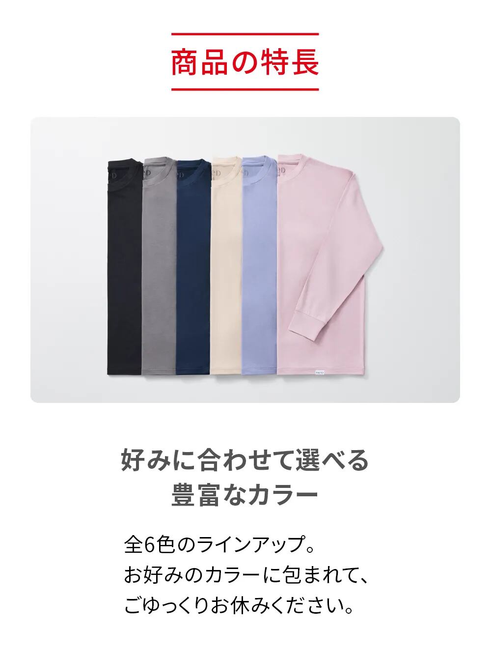 ゆったりとしたシルエットで寝返りがしやすく、ストレスフリーな着心地です。 吸水速乾性に優れているから、寝汗をかいてもさらっとした肌触り。
